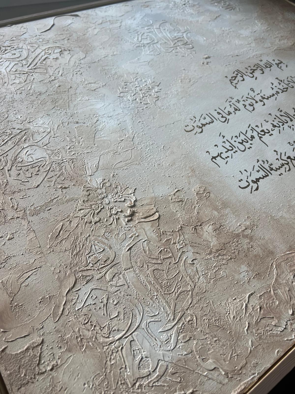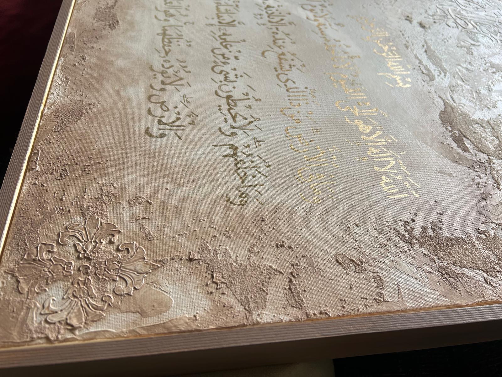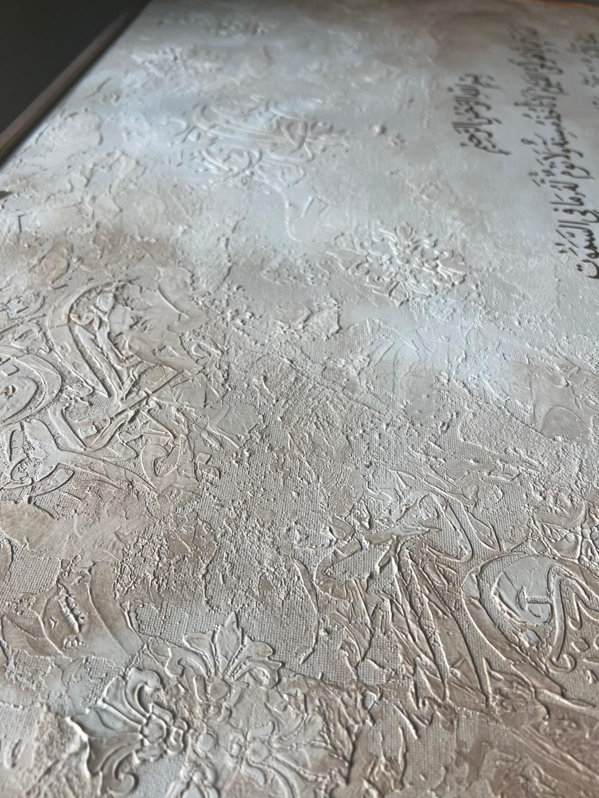 What sets this piece apart is its highly textured surface, achieved using mixed media techniques, giving the artwork a truly three-dimensional presence. The base is richly layered with abstract elements — featuring interwoven Arabic letters and delicate floral motifs — embossed and sculpted into the canvas. These raised textures not only add visual depth but also invite tactile engagement, reflecting both the sacredness and the artistry of Islamic tradition.