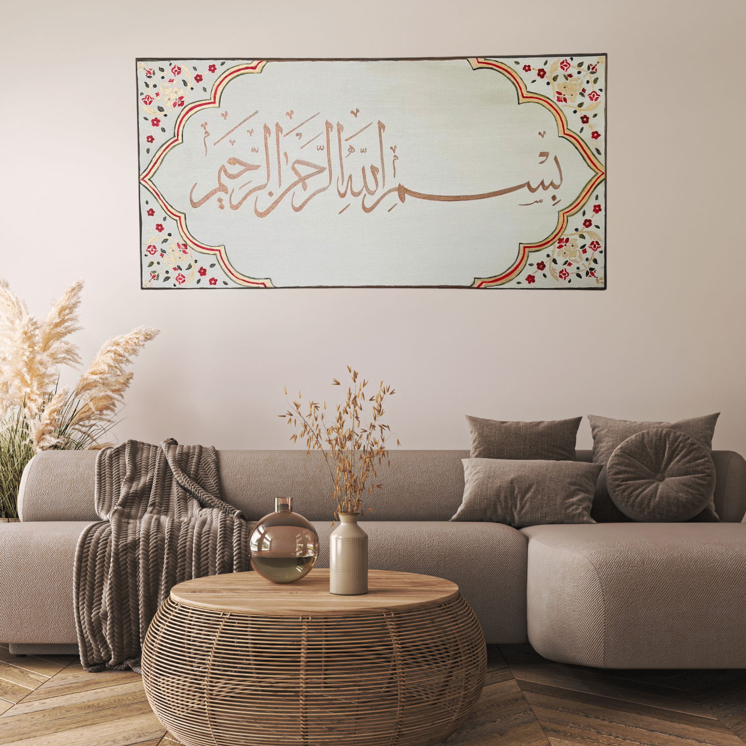 This captivating artwork showcases the timeless phrase “Bismillah hir-Rahman nir-Raheem” – meaning “In the name of Allah, the Most beneficent, the Most Merciful- rendered in iridescent brown ink, shimmering subtly with light. The calligraphy is framed by a Mughal-inspired background, featuring elegant arched edges adorned with intricate floral patterns that echo the grandeur of traditional Islamic design.
